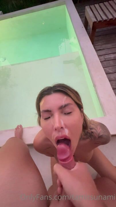 Tamitsunami lutscht einen Schwanz, bis er in der Nähe des Pools mit Sperma bedeckt ist (OnlyFans-Video).