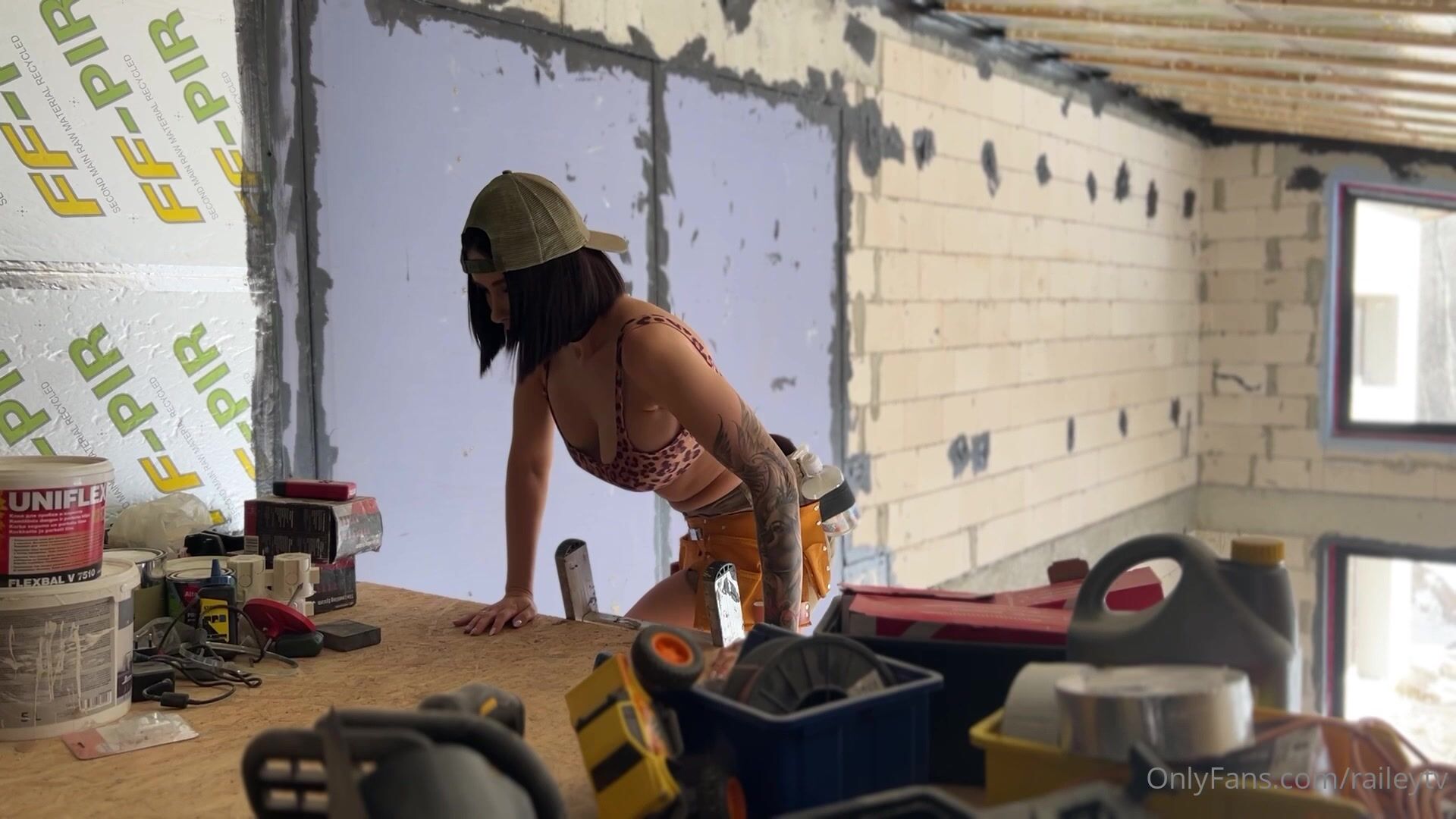 Tätowierte Schönheit Railey kann nicht widerstehen, sich mit einem pinken Dildo zu befriedigen, während sie in diesem dampfenden OnlyFans-Video auf der Baustelle arbeitet.