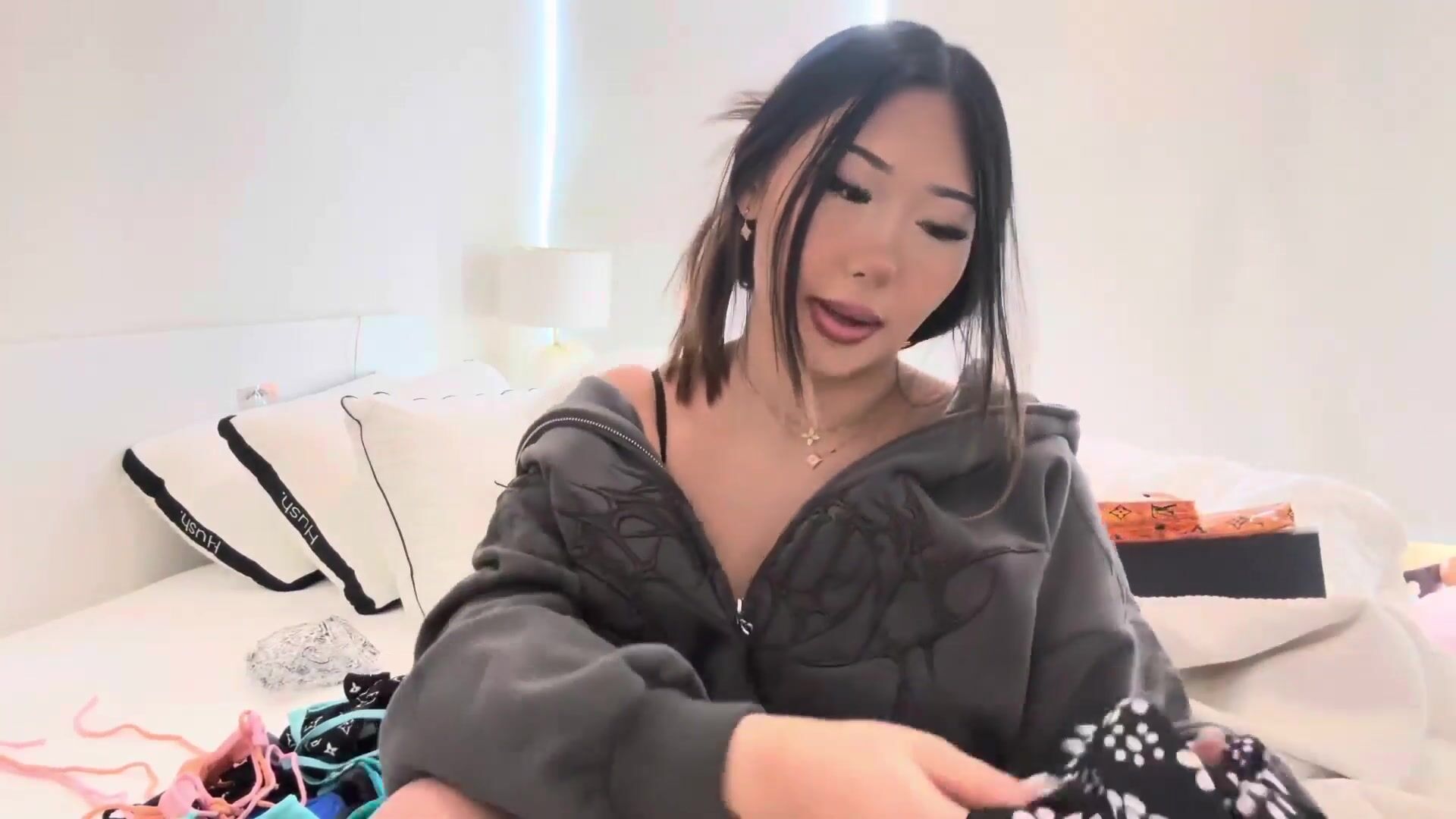 Asiatische Schönheit Emma Lvxx präsentiert ihre Lieblingsbikinis in einem sexy Schlafzimmer-Video, das ihre Kurven und ihren straffen Körper zur Schau stellt.