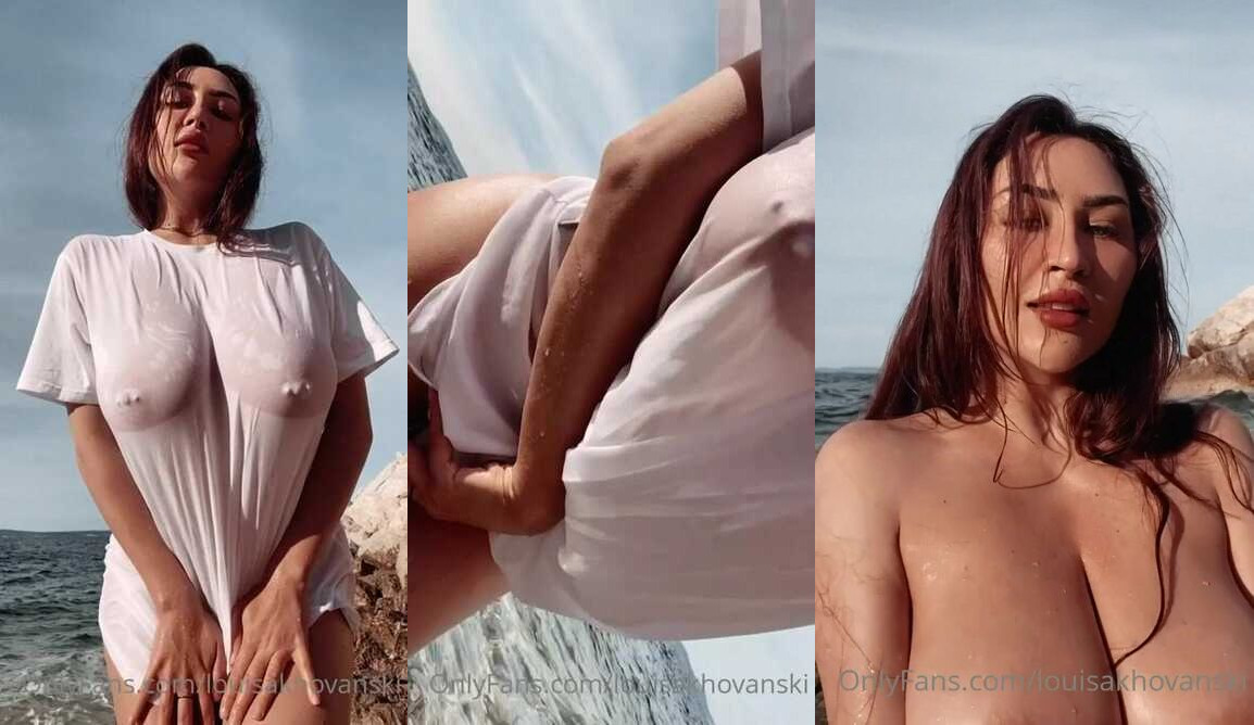 Louisa Khovanski wird am Strand in einem nassen weißen Oberteil verspielt und enthüllt dabei langsam ihre perfekten Titten und ihre Muschi in diesem heißen Video.