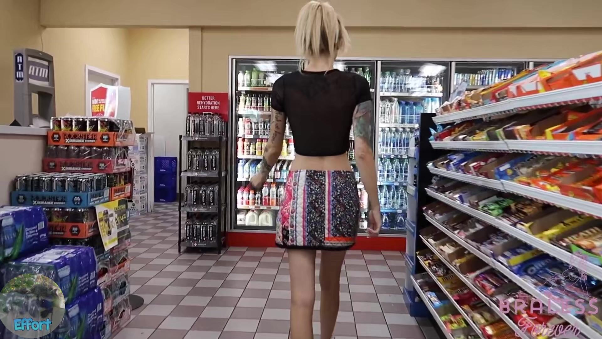BralessForever hält zum Tanken für dieses öffentliche Video und trägt dabei ein durchsichtiges Oberteil und einen kurzen Rock, der ihre Oberschenkel zur Schau stellt.