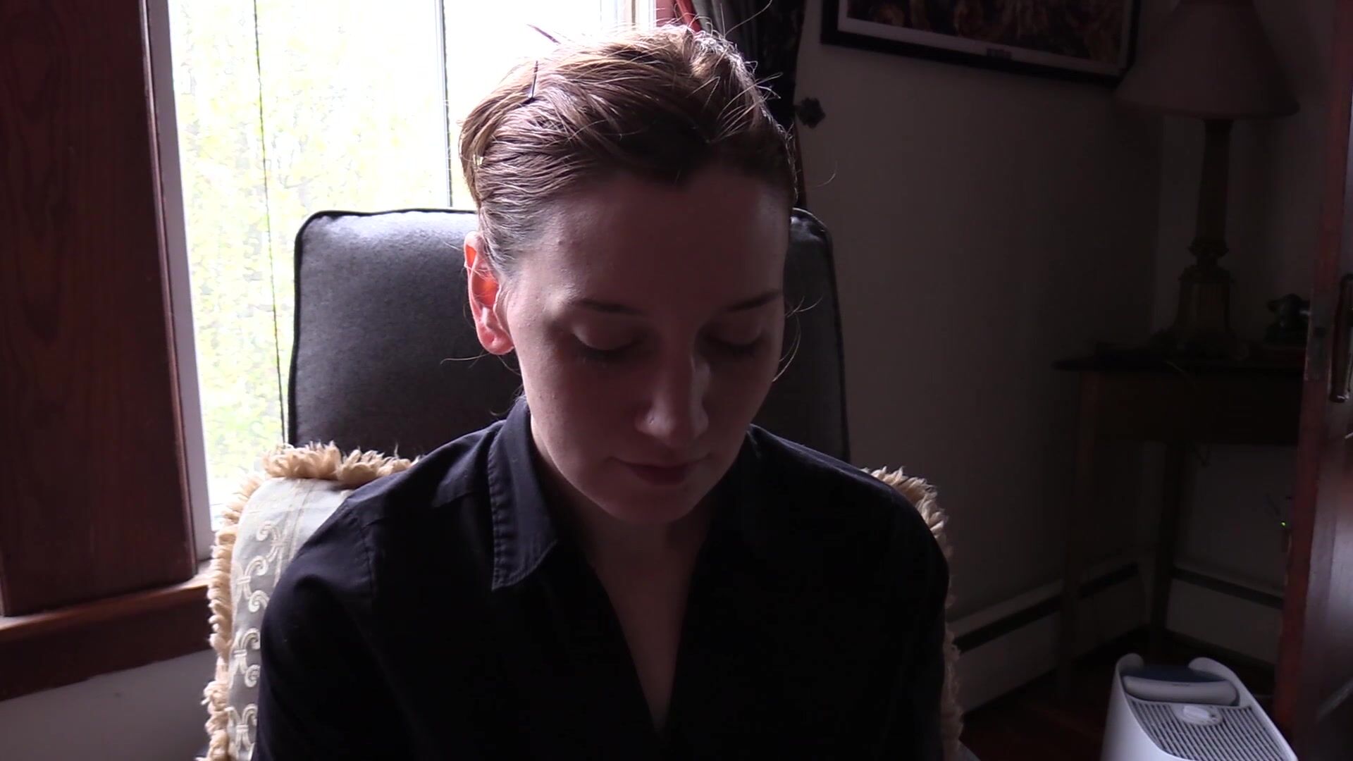 Bettie Bondage stars in Broken Arms III video with huge boobs exposed in a sexy black shirt.