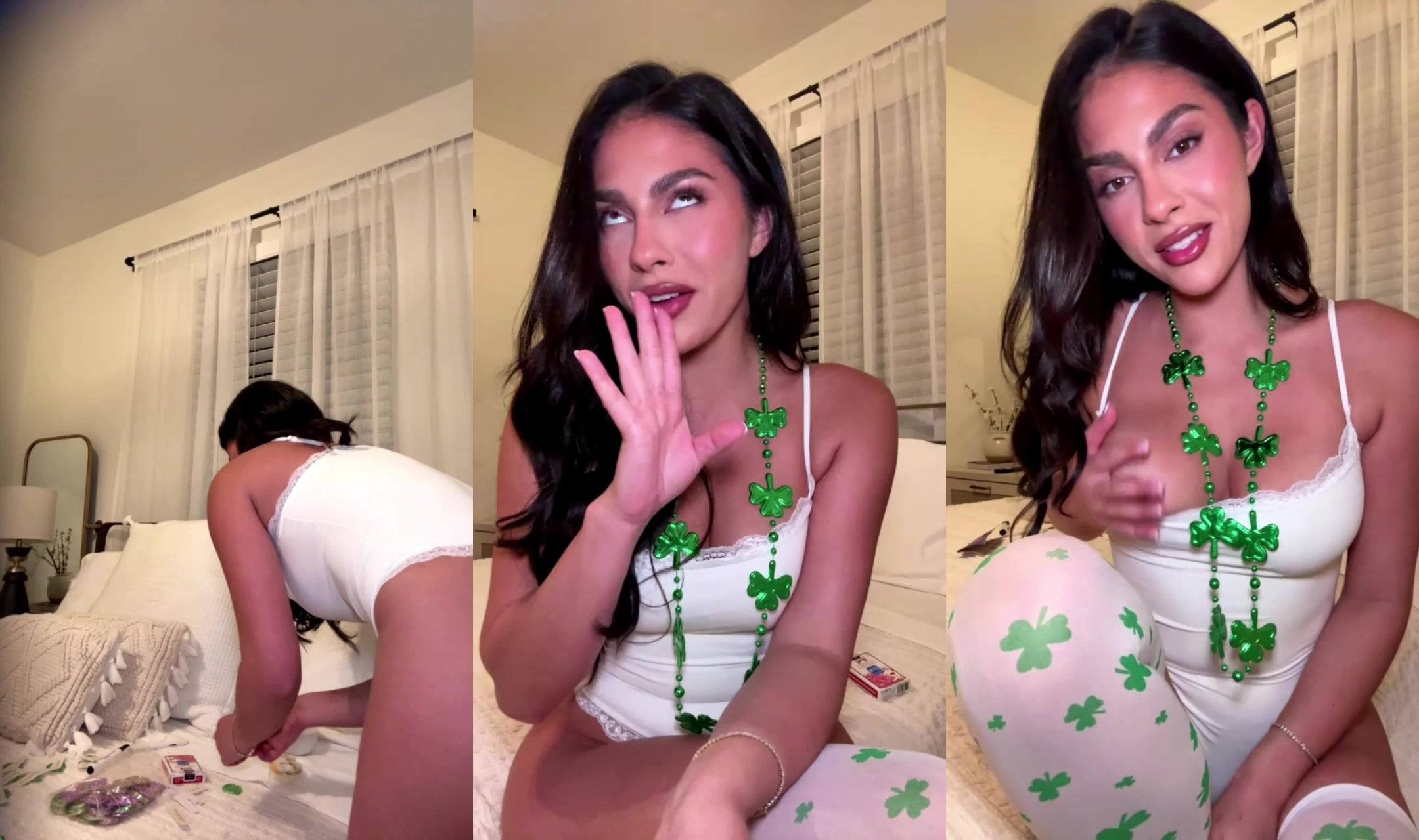 Un video en vivo juguetón con temática del Día de San Patricio con Amanda Trivizas en lencería blanca, provocando y presumiendo sus curvas frente a la cámara.