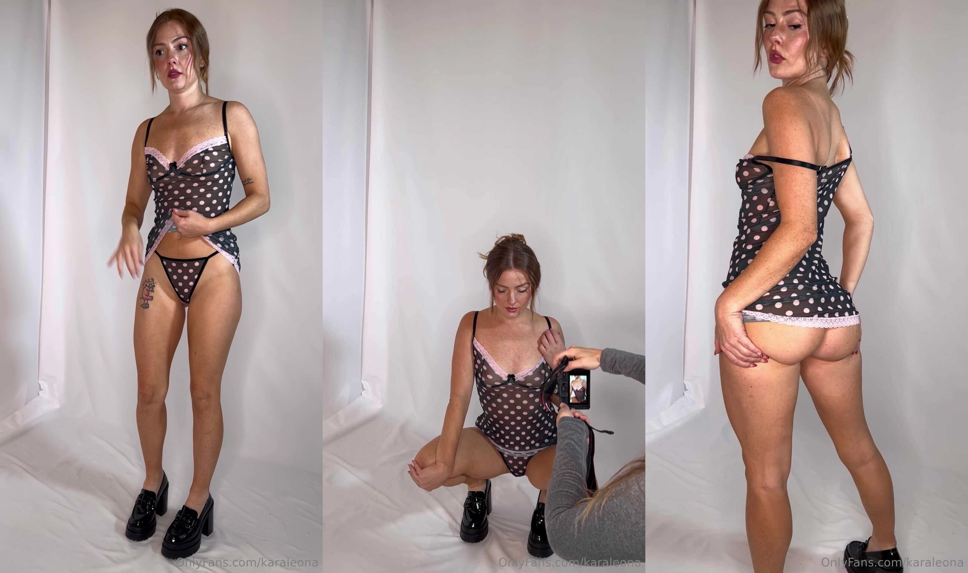 Karaleona de OnlyFans provoca en este video caliente, mostrando sus curvas en lencería de lunares y zapatos negros.