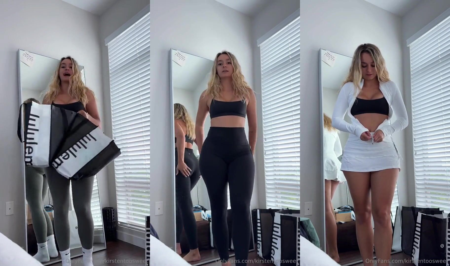 Blonde bombshell KirstenTooSweet teases in a sexy try-on haul, showing off her curves in tight outfits and crop tops in this exclusive OnlyFans video.