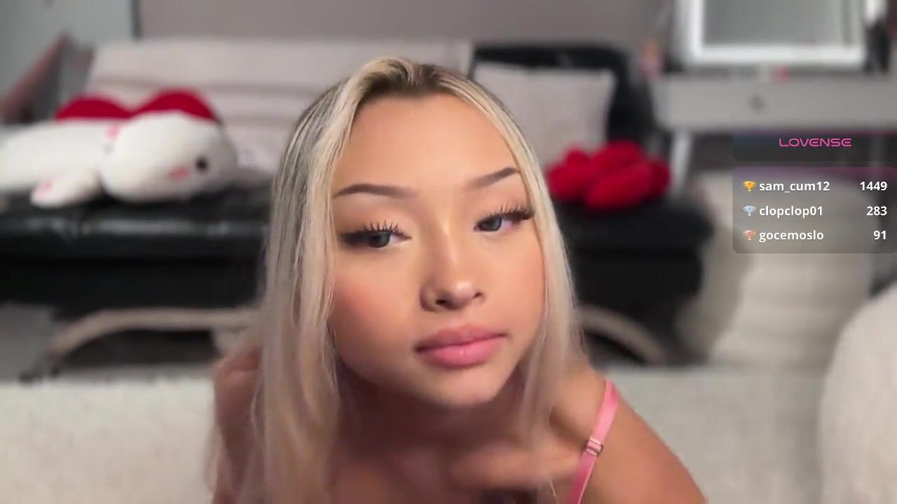 Blonde Asian petite cutie in pink lingerie loves teasing in this live stream video with her Lovense active for hours.