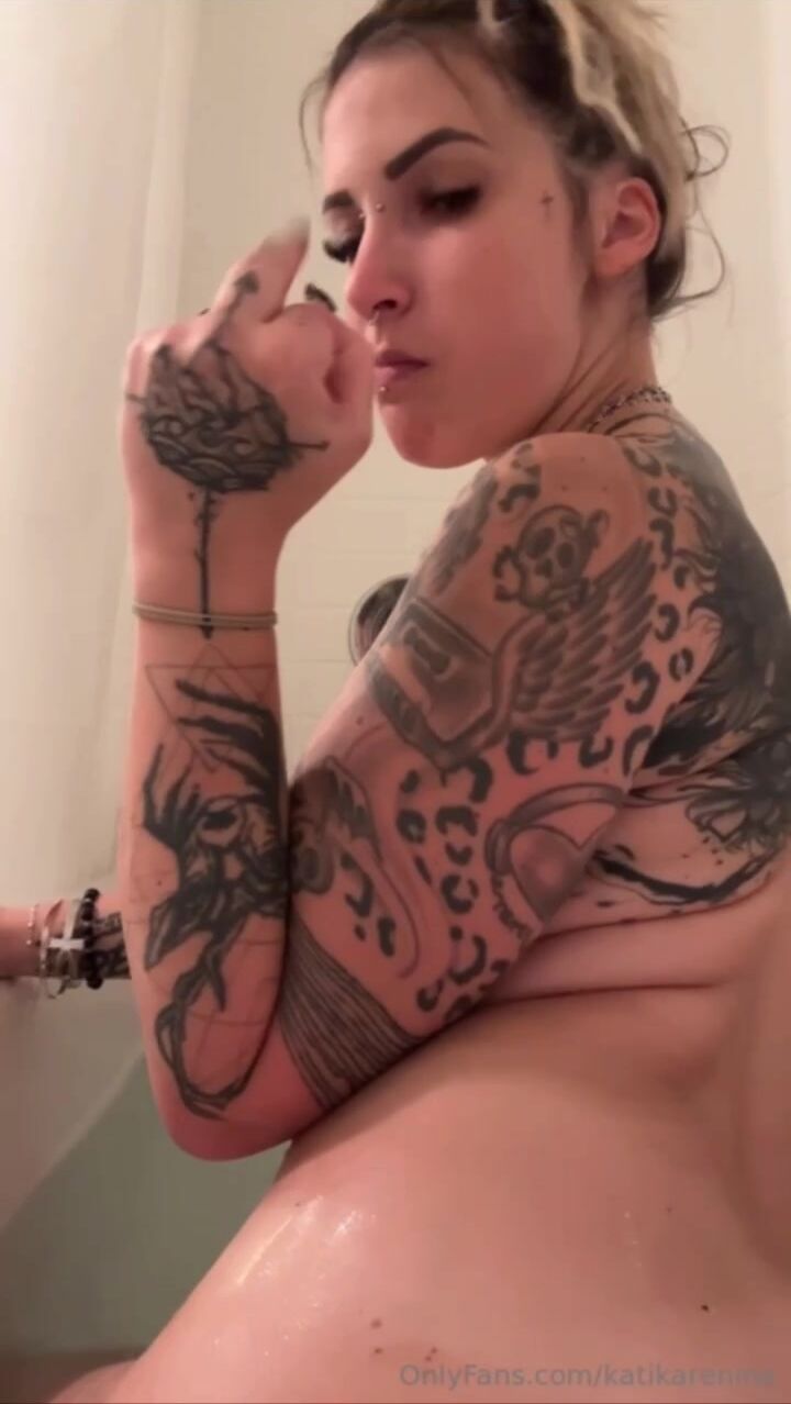 Kati Karenina se penche dans sa baignoire et se masturbe les deux orifices devant la caméra (vidéo OnlyFans).