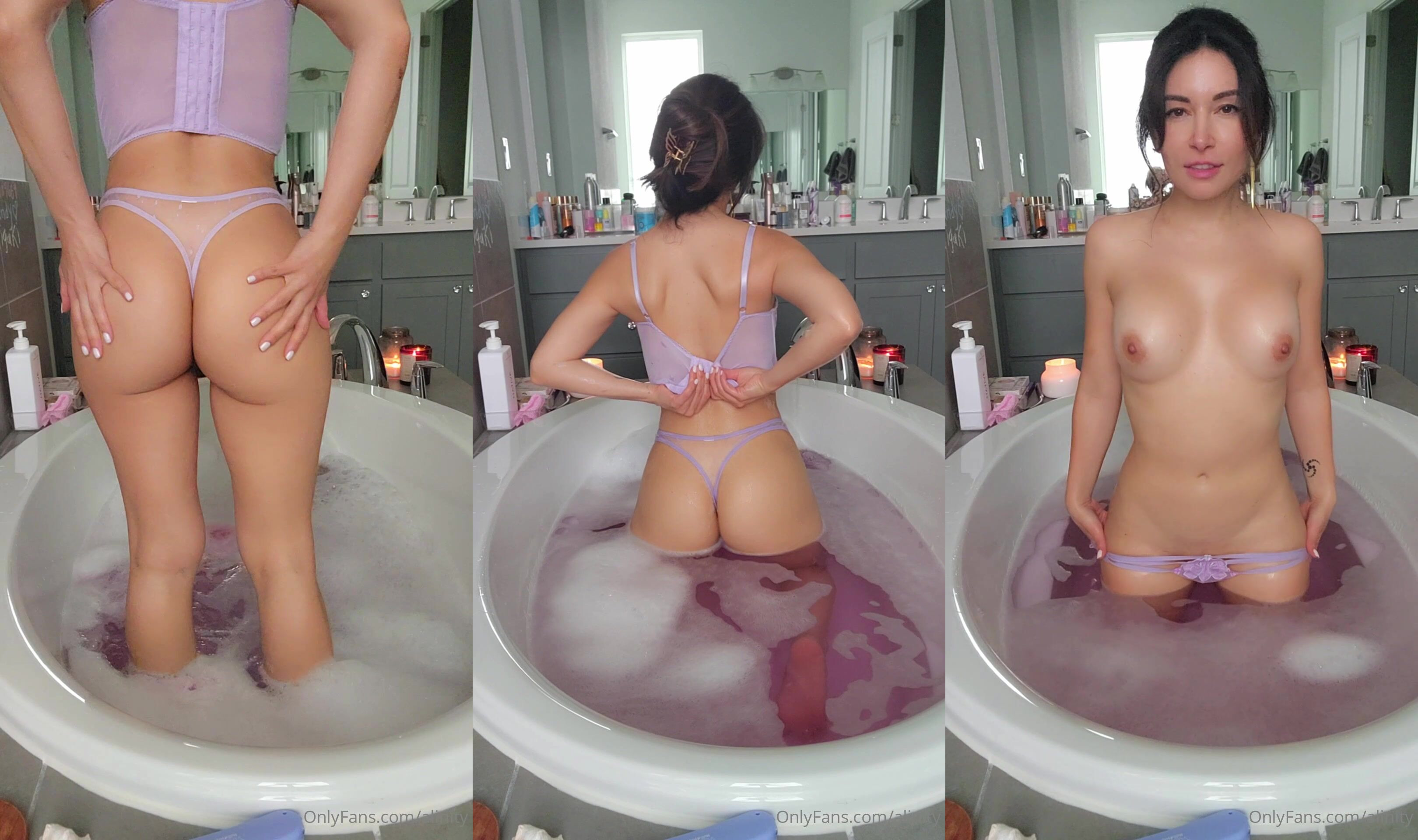 Alinity séduit dans un bain moussant portant de la lingerie violette dans cette vidéo aguichante d'OnlyFans.