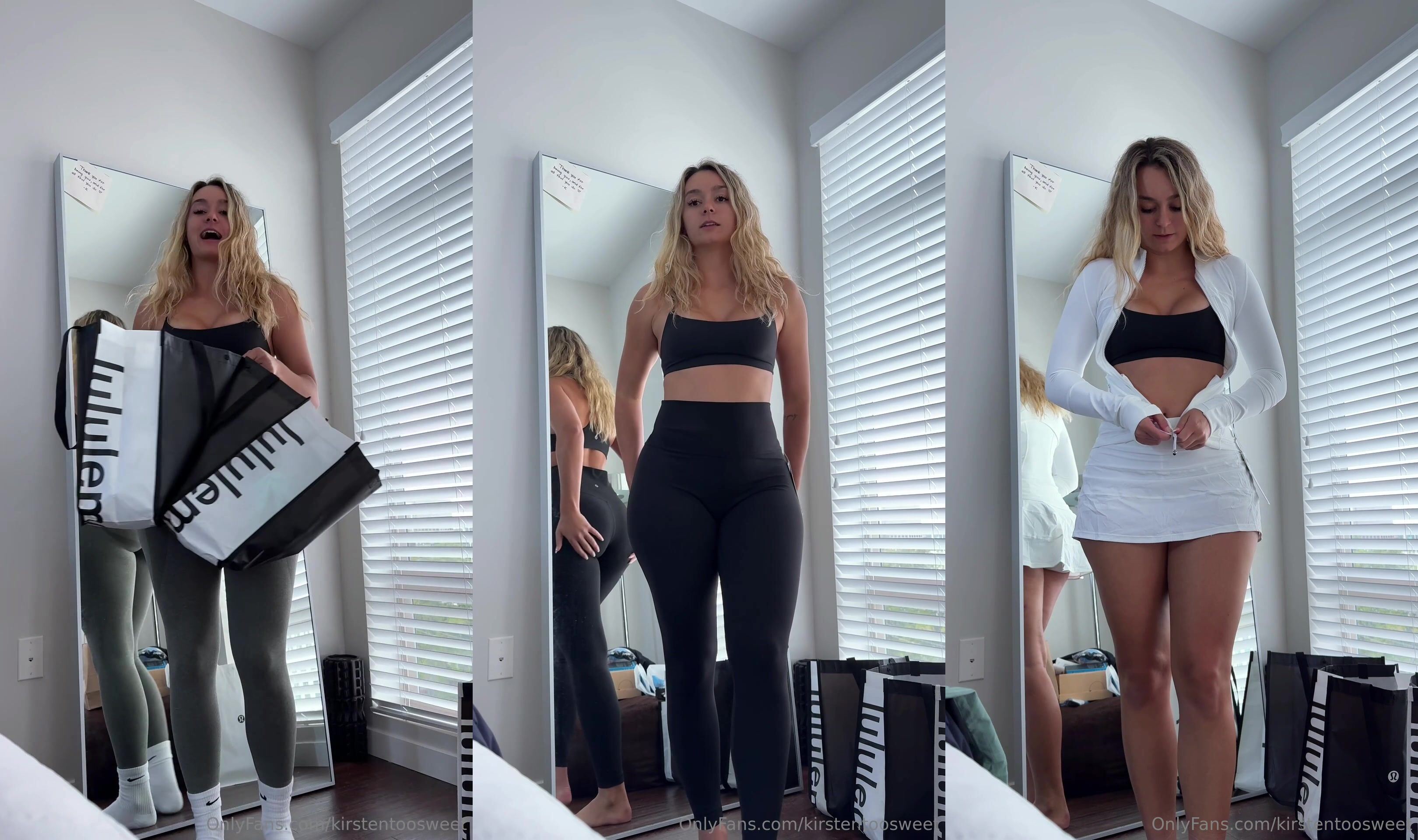 La bomba bionda Kirstentoosweet mostra il suo corpo in forma in questo video bollente, provocando con abiti aderenti e posando in modo seducente davanti allo specchio.