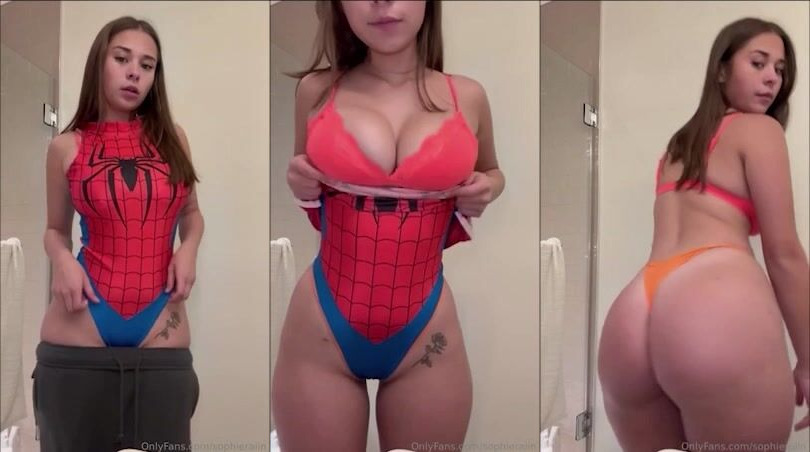 Sophieraiin teases in a Spiderman costume showing her big juicy booty and perky tits to the camera in this steamy video.