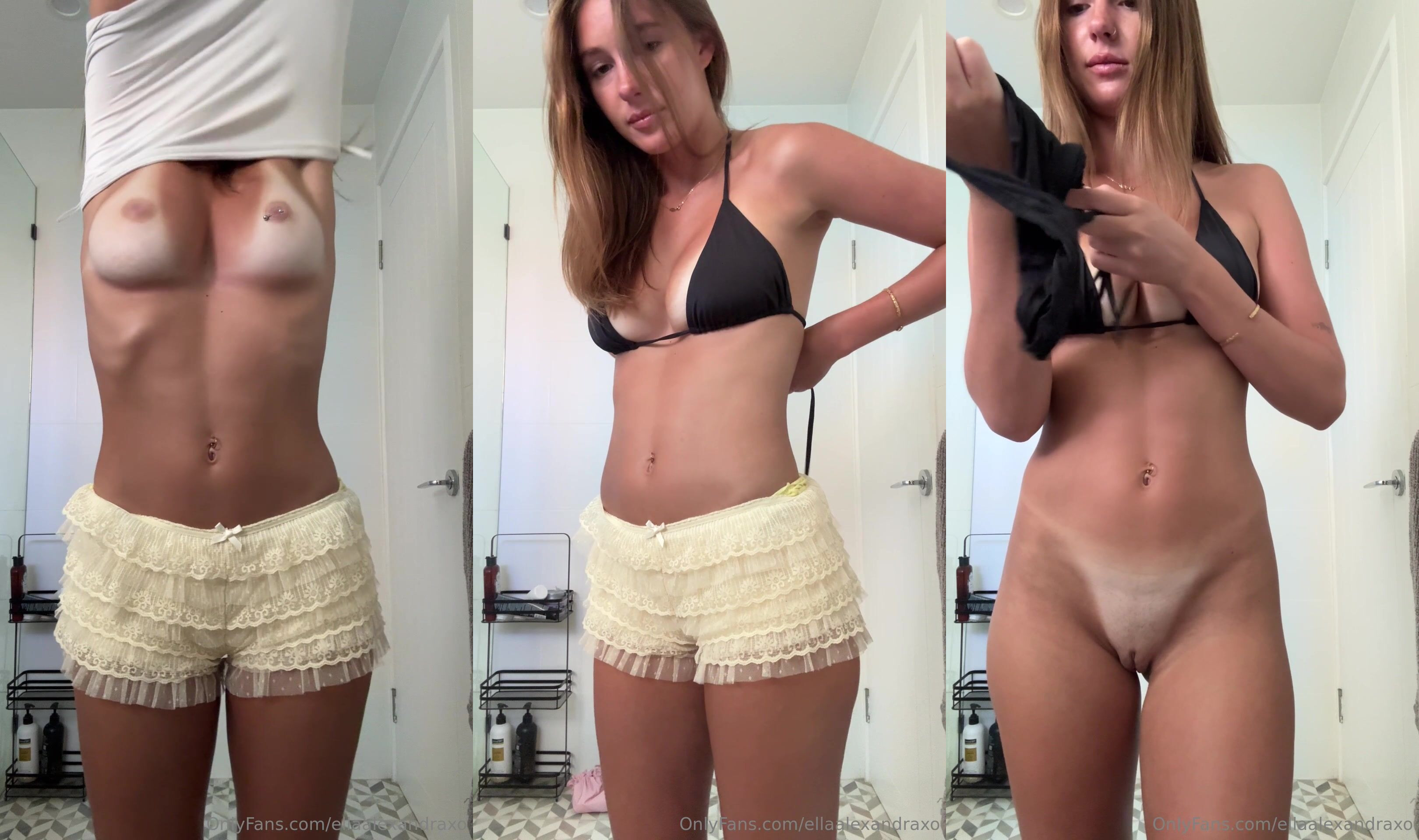 EllaAlexandraxo はこのビデオで服を脱ぎ、鏡の前でフィットなボディと黒のランジェリーを披露しています。