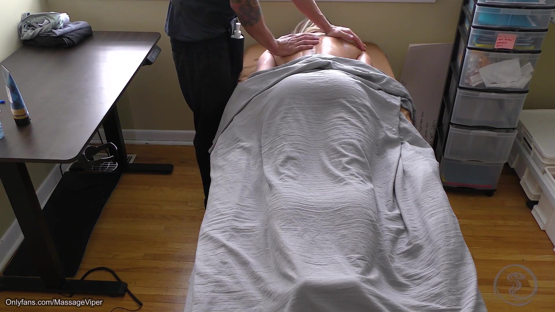Viper gets slippery and slides her super tight curves all over the table in part 2 of her steamy massage parlor fuck fest video