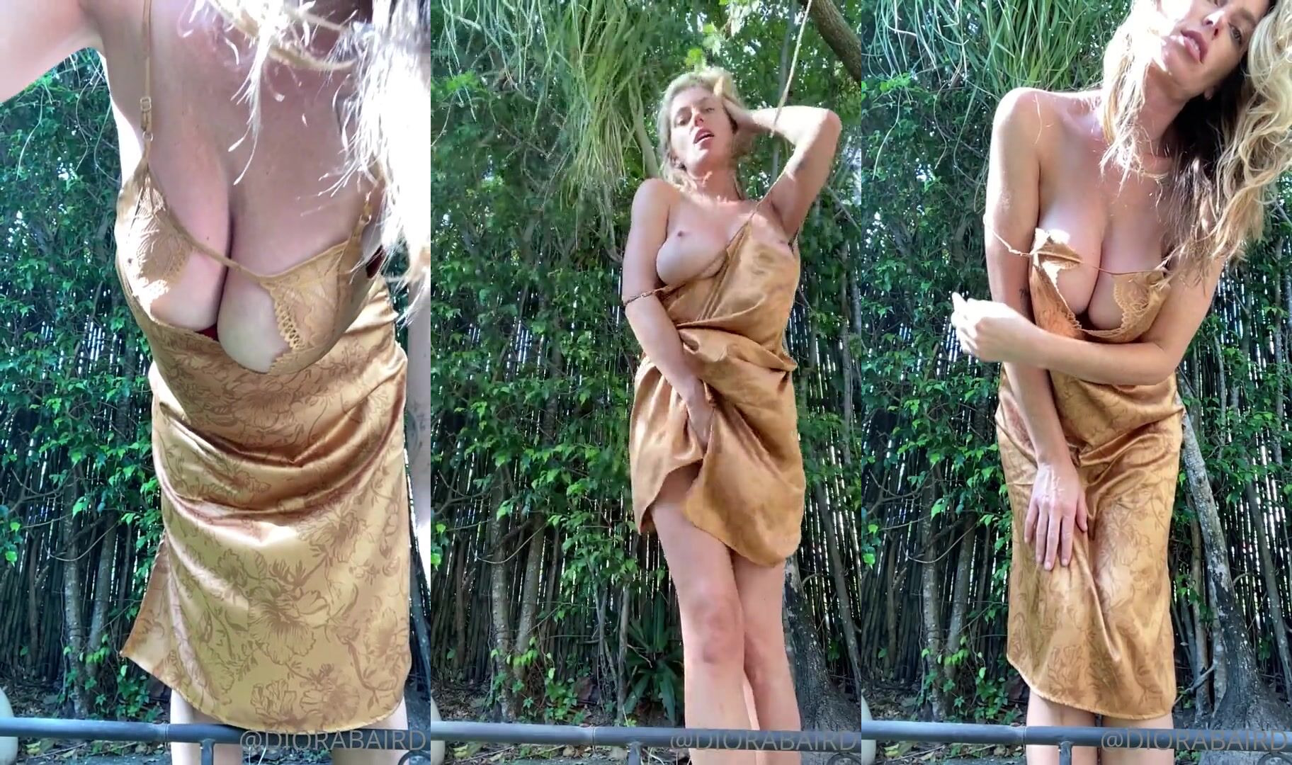 Diora Baird seduces in golden lingerie as she teases her curves and pussy in a steamy outdoor video.