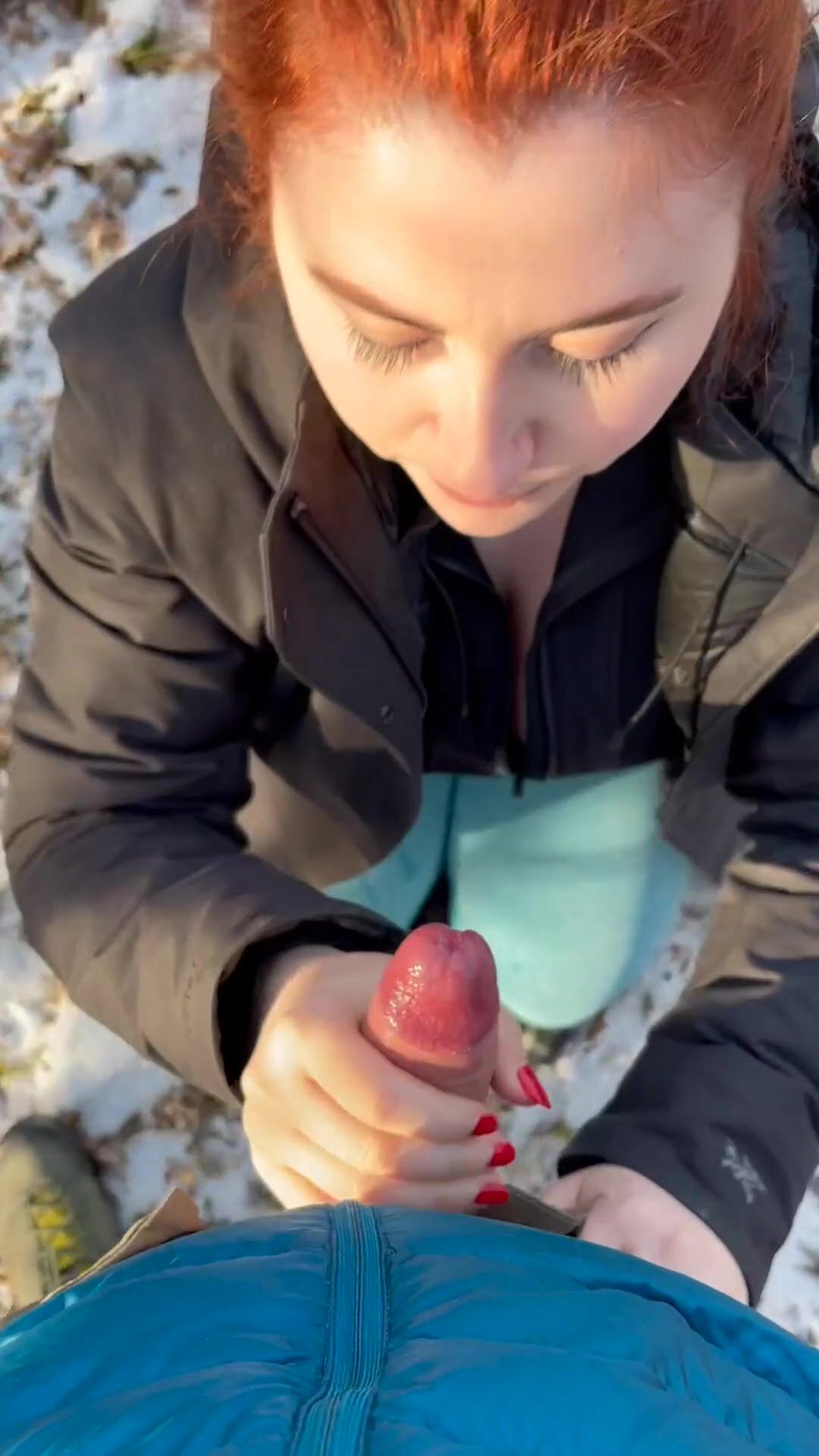 Isla Moon, ruiva e gostosa, chupa o pau do namorado com vontade no meio da floresta.