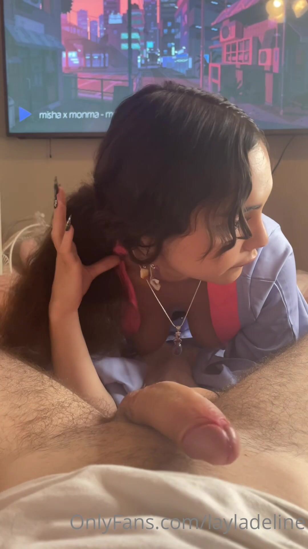 Layladeline fazendo sexo oral sensual na ponta do pênis e recebendo uma ejaculada no rosto (vídeo do OnlyFans)