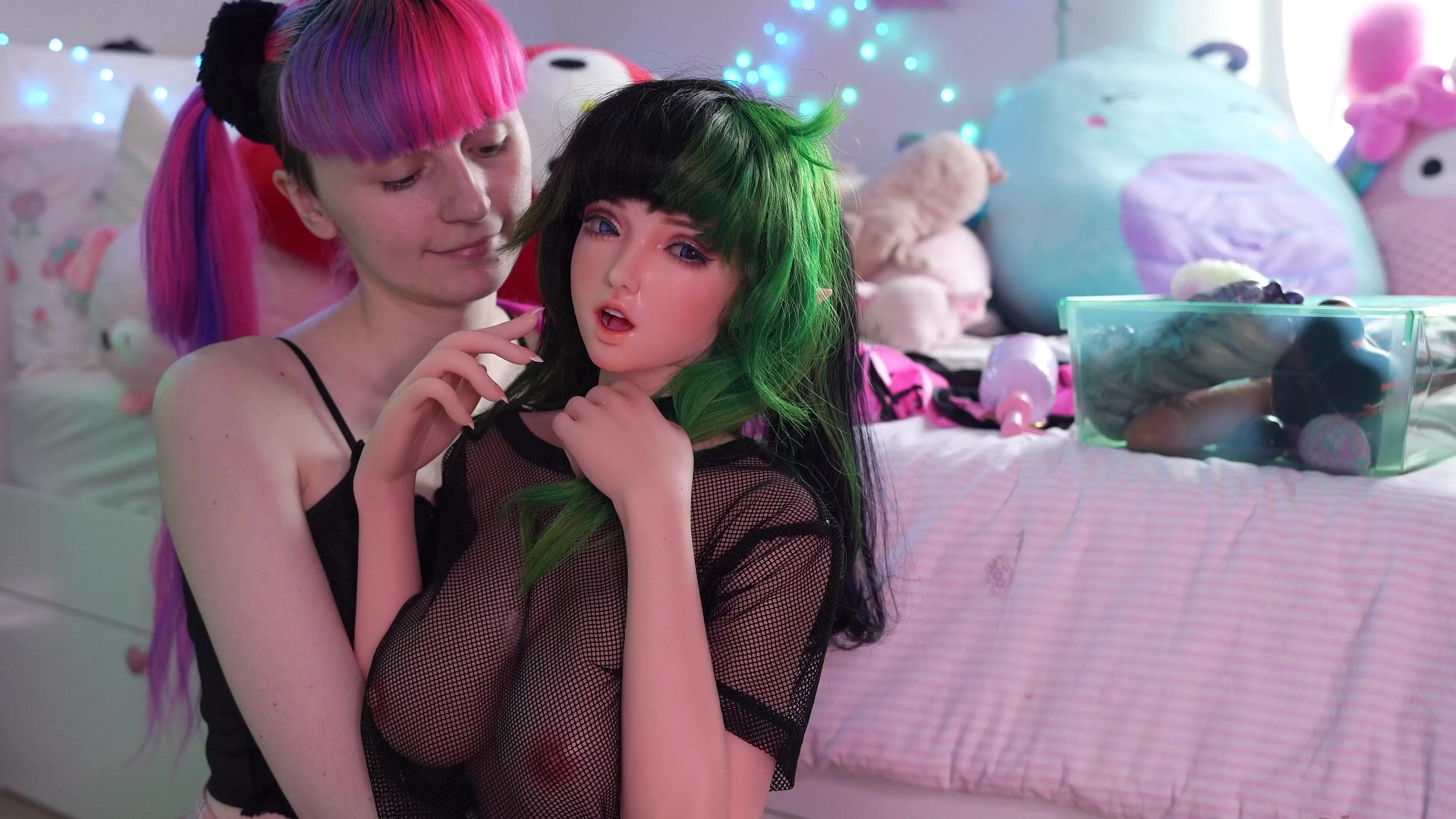 Tweetney aims to break in her sex doll's mouth with her fingers and strap-on. To even increase the enjoyment, she stuffed both her holes with large dildos using the strap-on to keep them deep inside her.