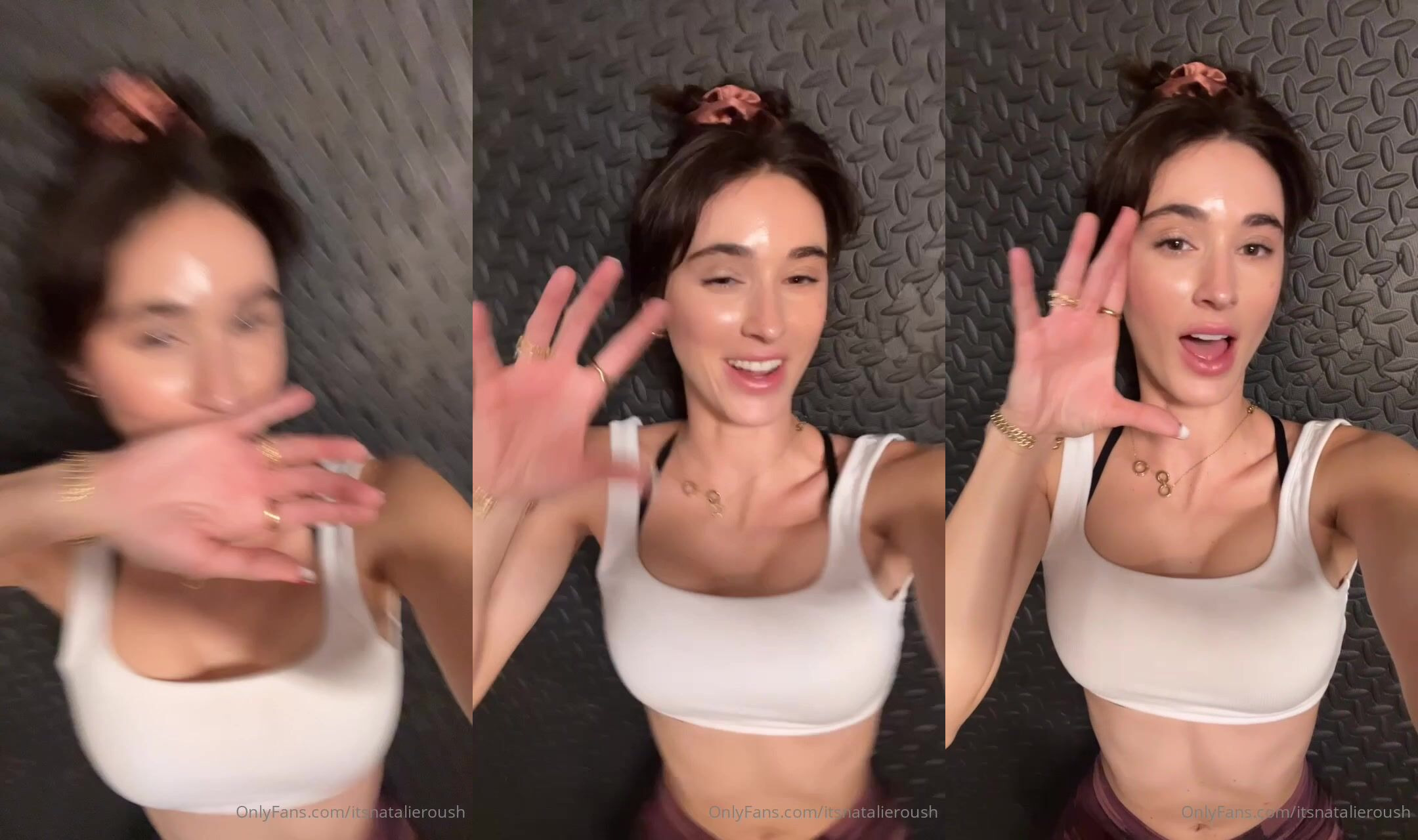 "Сексуальная брюнетка itsnatalieroush демонстрирует свои формы в белом спортивном лифчике"