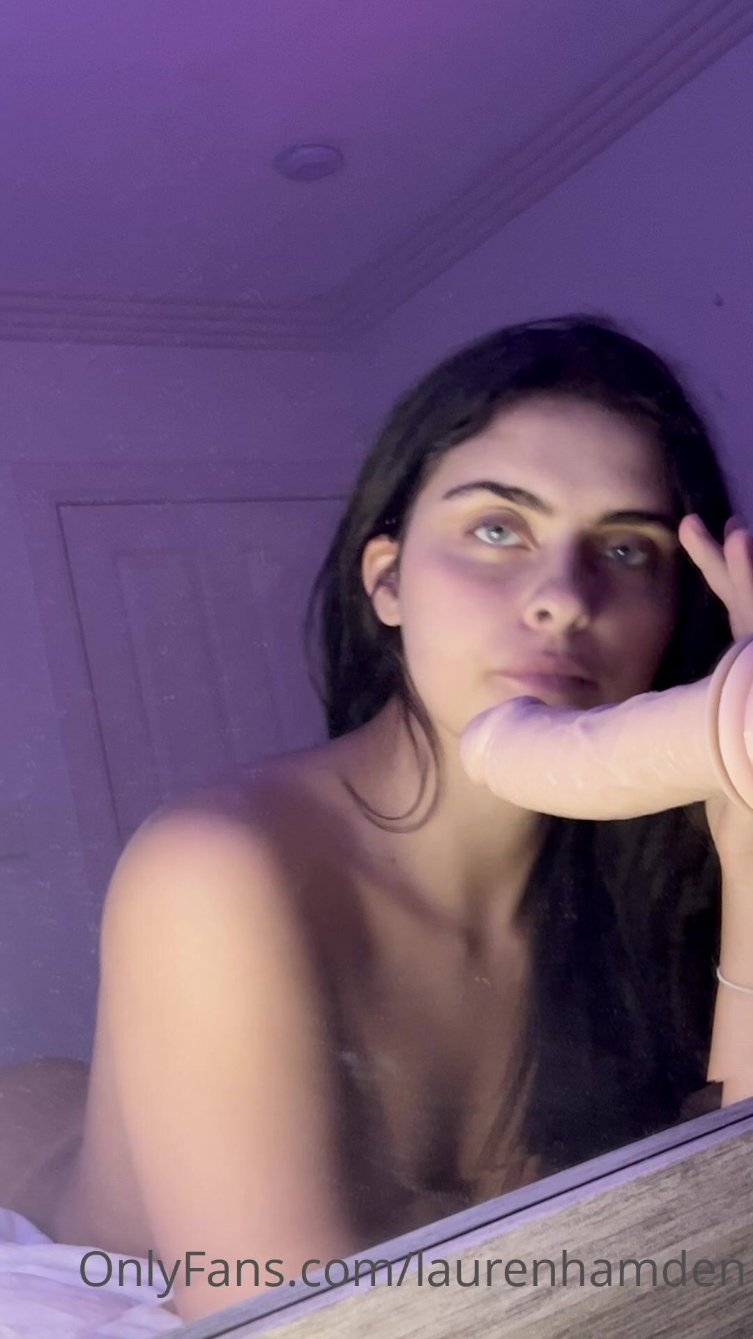 Lauren Hamden, OnlyFans videosunda yatakta çıplak haldeyken takılı bir dildoyu derinlemesine emiyor.
