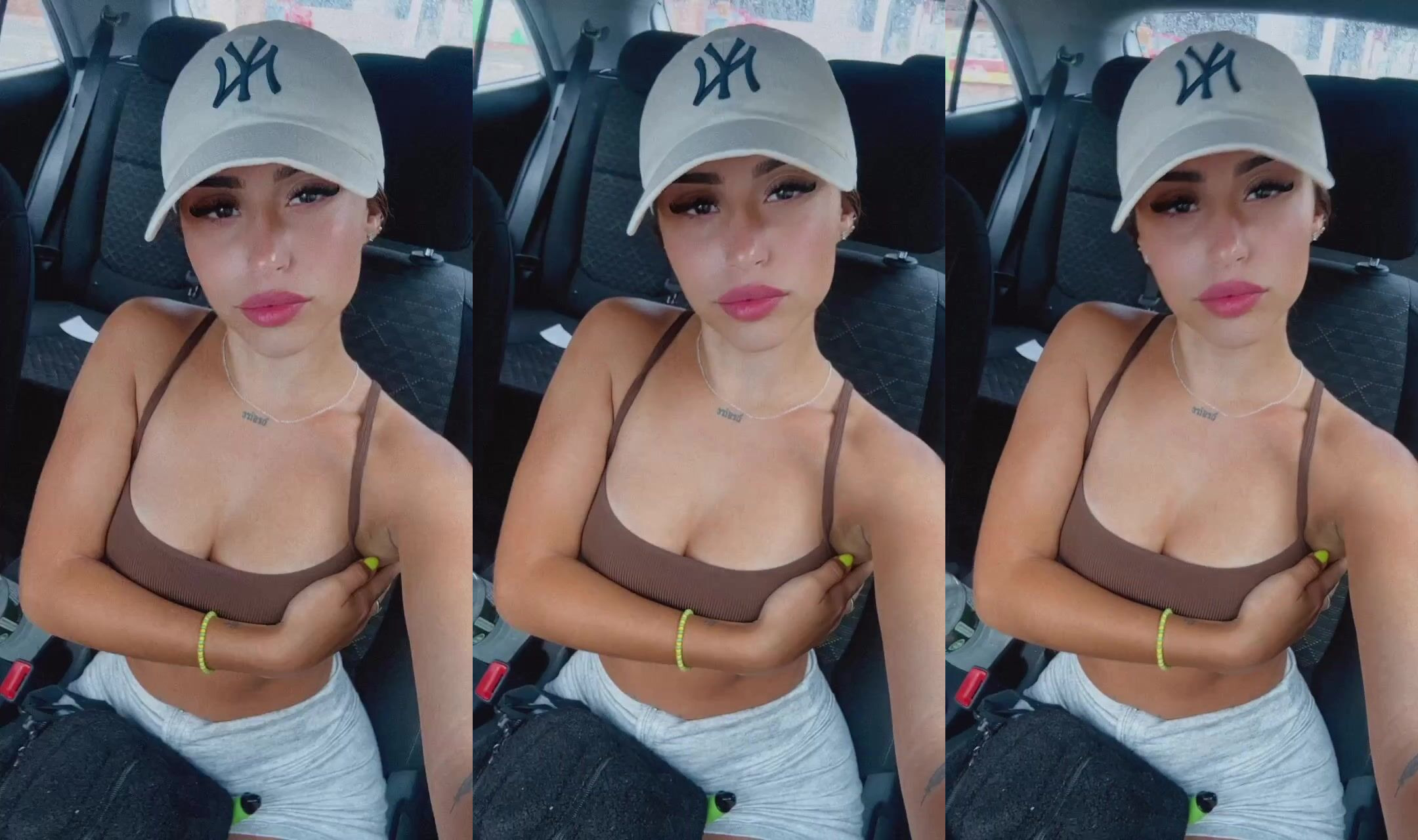 Bu sıcak klipte, harika bir kız araba arka koltuğunda oturuyor ve tesadüfen sevimli kahverengi bikini üstüyle eğrilerini gösteriyor. Oyuncu pozlar alıyor, kolunu çaprazlayarak dekoltesini vurguluyor ve kameraya doğru dudaklarını iriştiriyor. Güvenli ve kışkırtıcı tutumu sizi daha fazlasını isteyecek.