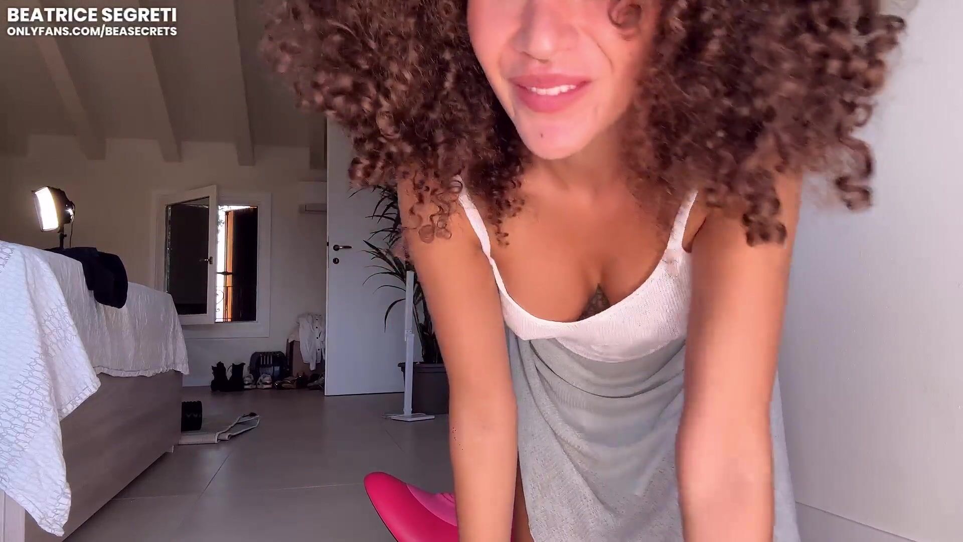 Kıvırcık saçlı esmer Beatrice Segreti, OnlyFans videosunda önce bir dildoyu emiyor, ardından onunla vajinasını beceriyor.