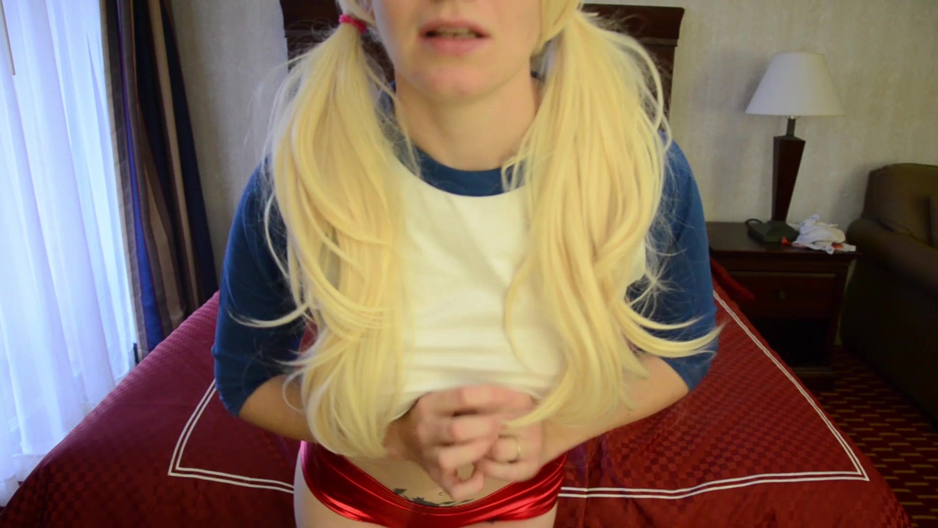Blonde Bettie Bondage strips naked in a sexy Harley Quinn cosplay outfit in this fun video.