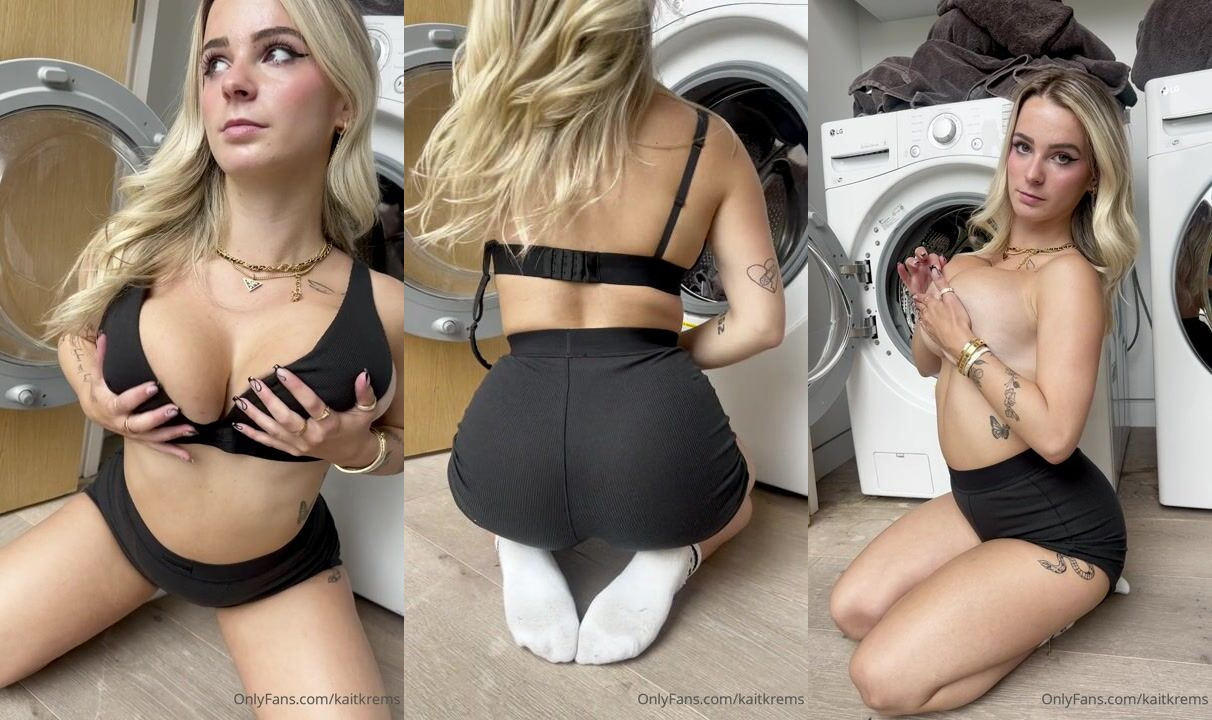 Blonde babe Kaitkrem's gets naughty in the laundry room, teasing in sexy black lingerie and flaunting her curves.